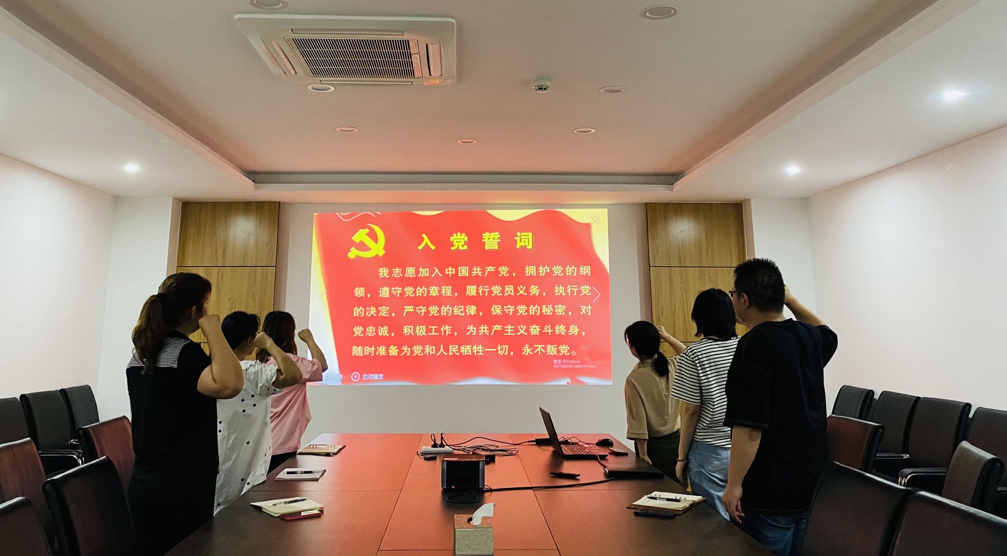 在鮮紅熱烈的黨旗的見證下,易測黨員們整齊列隊、神色莊嚴,高舉右拳,重溫入黨誓詞。他們以鏗鏘有力的誓言表達了對黨的衷心,體會到作為一名共產黨員應盡的責任感及使命感。