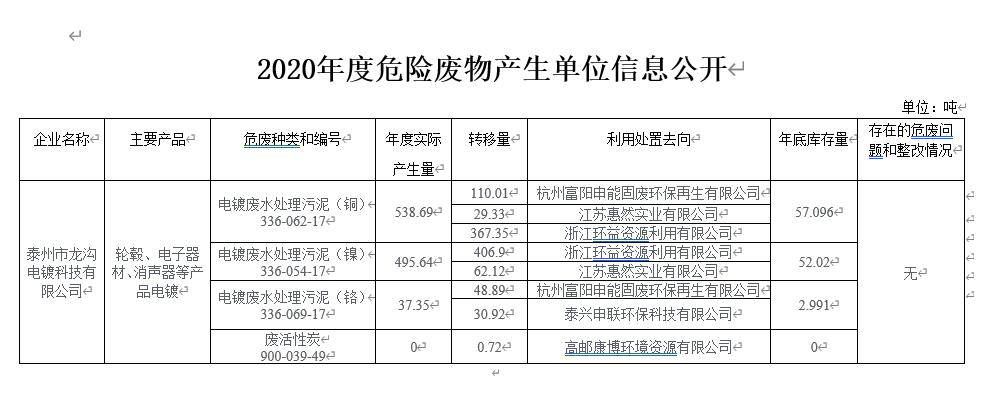 項目公示 | 泰州市龍溝電鍍科技有限公司2020年度危險廢物信息公開
