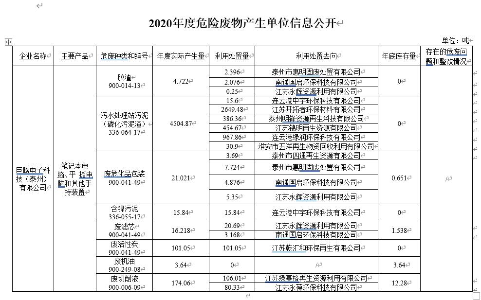 項(xiàng)目公示 | 巨騰電子科技(泰州)有限公司2020年度危險(xiǎn)廢物信息公示